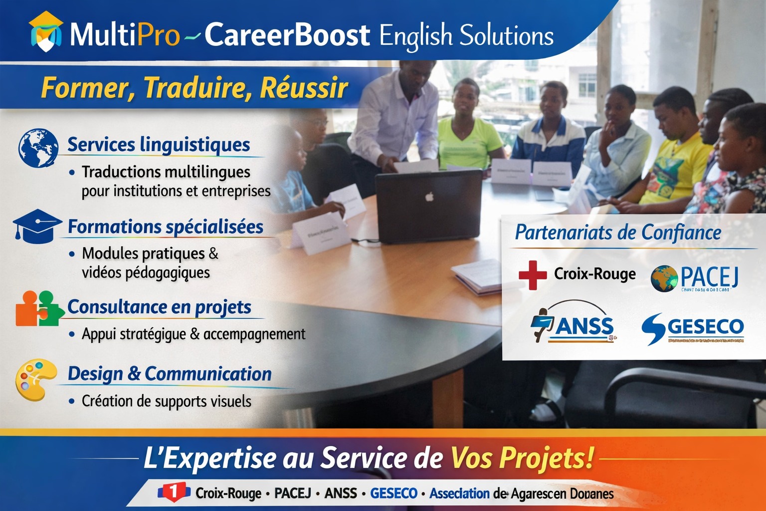 Established in 2021 and headquartered in Bujumbura, Burundi, MULTIPRO – Multiservice Provider Business (SPRL) specializes in language services, professional training, and project consulting.MULTIPRO works with local clients, regional partners across East Africa and the Great Lakes, and international organizations. We provide solutions that meet global professional standards and address the needs of both public and private institutions.